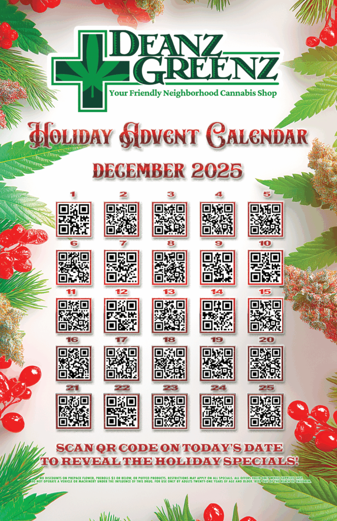 Visit Us Today! Come say hi, check out the Advent Calendar board in the lobby, and let our budtenders help you find the perfect holiday strain.